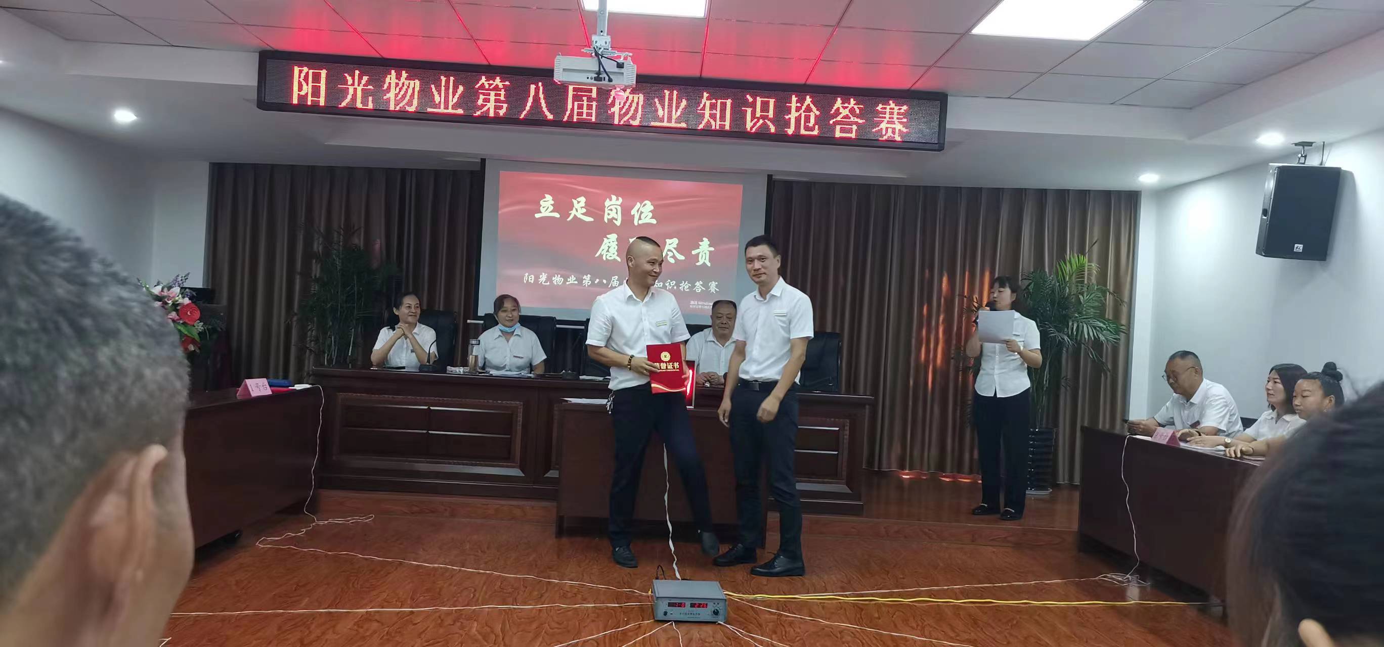 在大家共同的協(xié)調(diào)和配合下,陽光物業(yè)第八屆物業(yè)管理知識(shí)搶答賽取得圓滿成功?;顒?dòng)現(xiàn)場(chǎng)掌聲雷鳴,充滿了歡快熱鬧的氣氛,各參賽隊(duì)積極參與,主持人風(fēng)趣幽默,現(xiàn)場(chǎng)井然有序,笑聲不斷。比賽由必答題、搶答題、風(fēng)險(xiǎn)題、觀眾答題四個(gè)環(huán)節(jié)組成。經(jīng)過一番激烈的競(jìng)爭(zhēng),最終由仙源保障房、廉租房組合的完美隊(duì)取得第一名,由廣德花苑、陽光鑫都組合的輝煌隊(duì)獲得第二名,總部和公園壹號(hào)組合的葵花隊(duì)取得了第三名,陳勇同志以答對(duì)9題的優(yōu)異成績(jī)脫穎而出獲得優(yōu)秀答辯手獎(jiǎng)項(xiàng)。